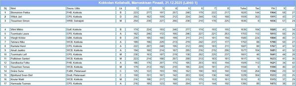 Ennen viimeistä sarjaa Pekka Blomströmin ja Jari Witickin välinen ero oli 30 pistettä, joten viimeinen sarja ratkaisi voittajan. FHB:n Pekka Blomström lopetti hienosti 235 sarjalla (tas 18), jolla varmisti Marraskisan voiton. Pekan voittotulos oli huikeat 1964 (puhdas 1820). Hopeasija irtosi Jarille tuloksella 1911 ja pronssia Simon Tissariselle tuloksella 1836.